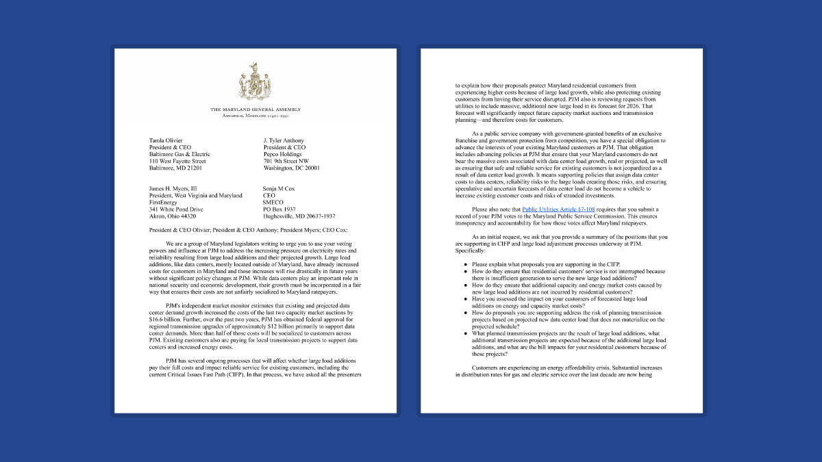 We are a group of Maryland legislators writing to urge you to use your voting powers and influence at PJM to address the increasing pressure on electricity rates and reliability…