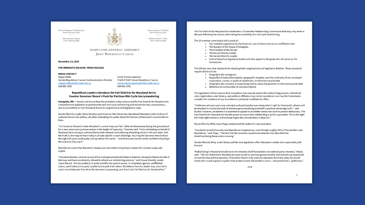 Senate and House Republican leaders today announced the Fair Districts for Maryland Act, comprehensive legislation to permanently end mid-cycle redistricting and restore fairness, transparency, and accountability to how Maryland draws…